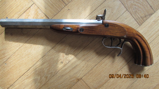 Match Vorderladerpistole mit Stempelung Präzisionslauf“ unter dem Lauf, Perkussionssystem mit dt. Stecher; Funktion nicht überprüft.
