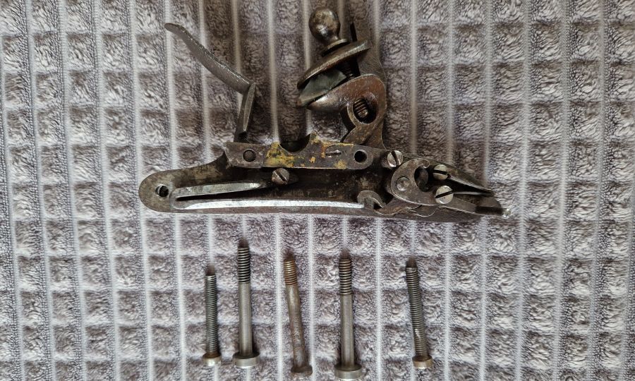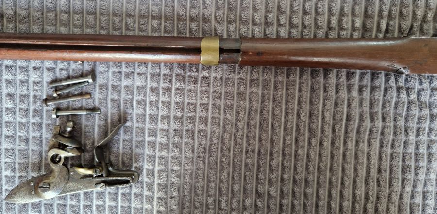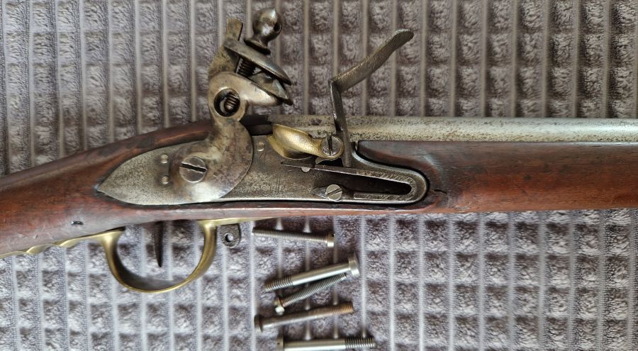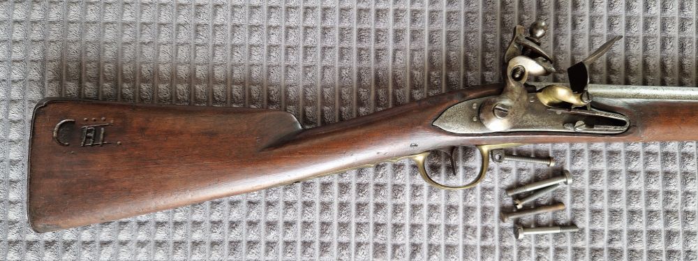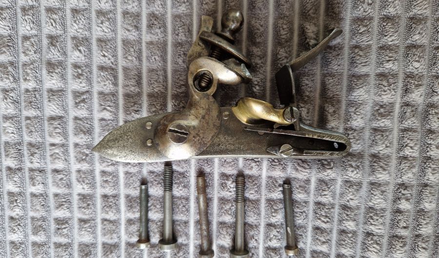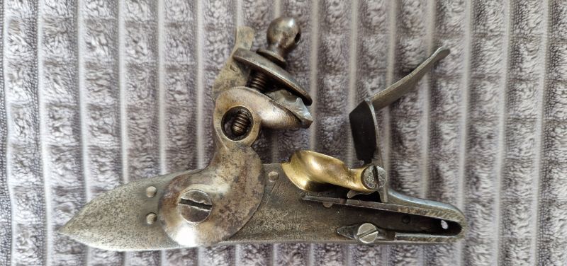 Signiertes Steinschloß. Tulle usw. - siehe Fotos. 2 Rasten, gute Funktion. Hahn alt ergänzt. Schloßschrauben zum Anpassen anbei.