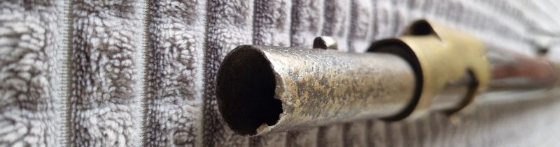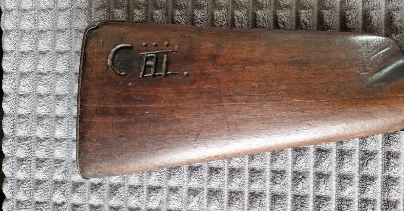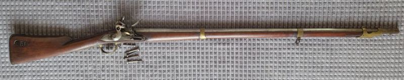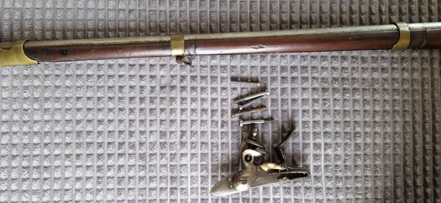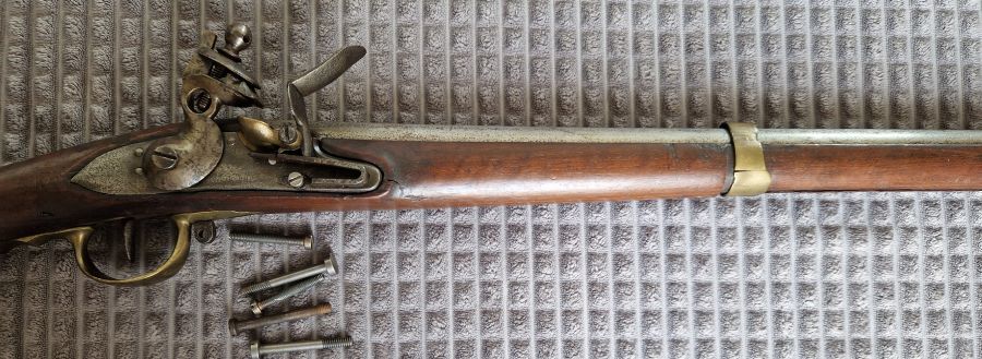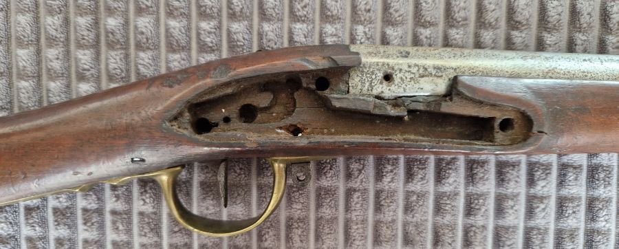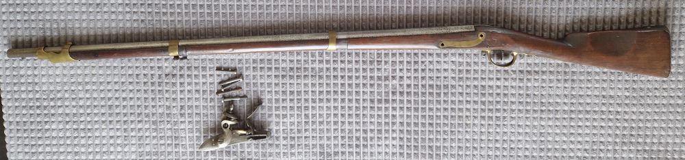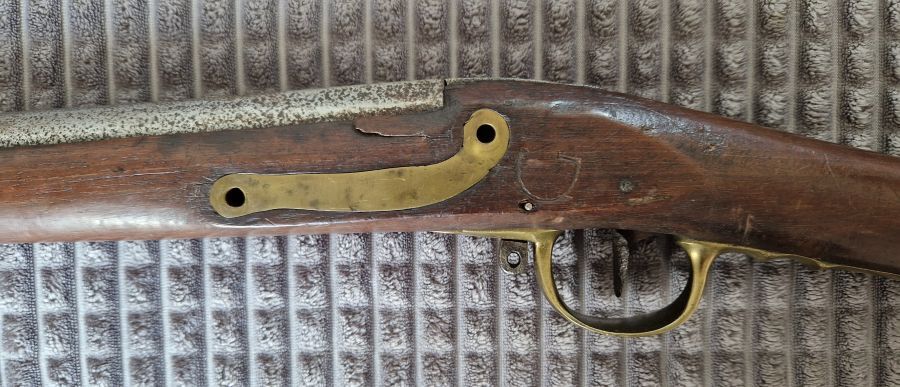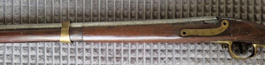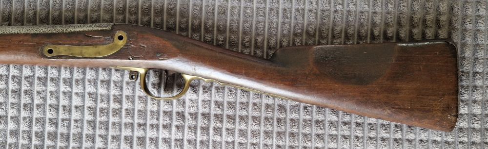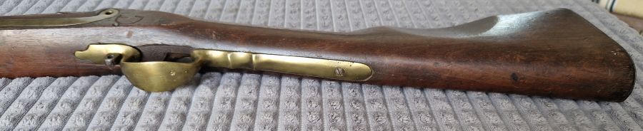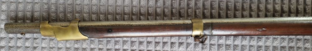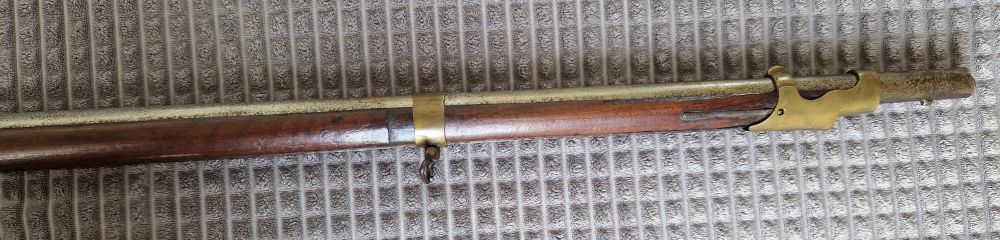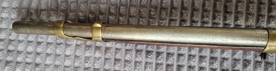 Messingbeschläge. Kolbenkappe in Eisen. Vorderer Messingbund mit Feder. Die zwei hinteren ohne Feder.