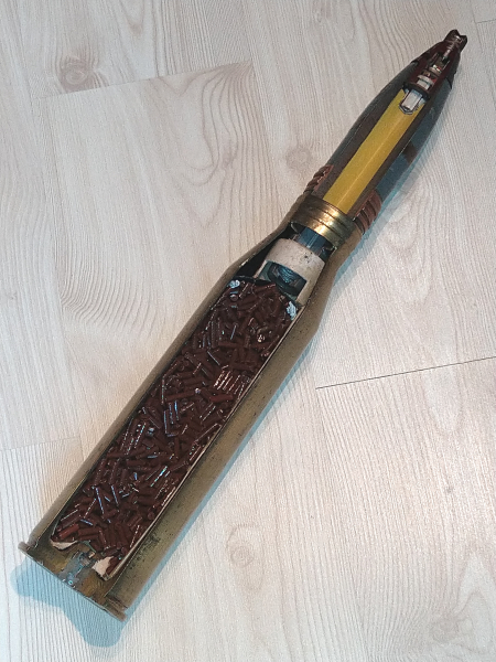 Schnittmodell einer 57mm Splittergranatpatrone UOR-281U für die Flak S-60 und die Fla-SFL ZSU-57-2. Lizenzfertigung aus Polen. Detailreiches Unterrichtsmodell mit Plaststücken zur Darstellung der Treibladung. Dieses Schnittmodell wurde nachträglich mit einem Zünder MGZ-57 (ebenfalls als Schnittmodell) komplettiert (ursprünglich wurden diese Modelle ohne Zünder ausgeliefert). Alles frei von jeglichen Gefahrstoffen, inert.