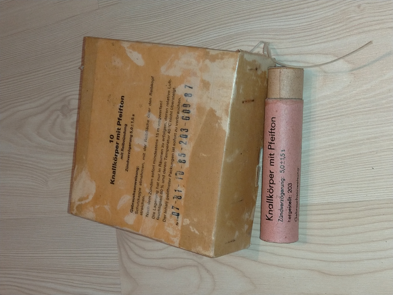 1x NVA Knallkörper mit Pfeifton. Komplett mit Verpackungskarton. Knall- und Pfeifsatz wurden entfernt. Frei von jeglichen Gefahrstoffen, inert.