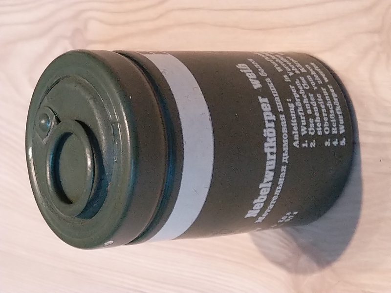 Nebelwurfkörper weiß aus DDR-Produktion. Das Innenleben und der Nebelsatz wurden über ein Loch im Boden komplett entfernt. Frei von jeglichen Gefahrstoffen, inert.