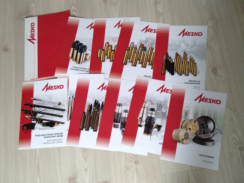 Werbedokumentation des polnischen Herstellers Metallwerke Mesko aus den 2000er Jahren. Eine Mappe mit 10 verschiedenen Datenblättern mit Bildern der Erzeugnisse und ihren taktisch-technischen Daten. Die Datenblätter umfassen Munition für Schützenwaffen und Maschinenkanonen, Geschoss- und Handgranatenzünder, Zündschrauben sowie den tragbaren Fla-Raketenkomplex "Grom".