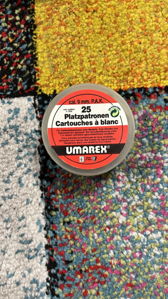 Zum Verkauf steht je Sofortkauf eine Packung 9mm PAK Platzpatronen (25 Stück) der Firma Umarex.