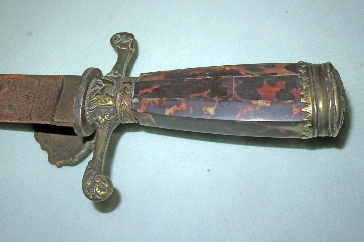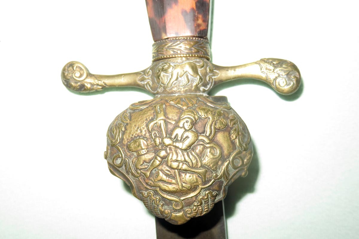 Alter Hirschfänger mit jagdlich reliefierten Stichblatt/Muschel/Parierstange, einem achteckigen Griff belegt mit Schildpatt über einem Holzkern, sowie verzierten Messingring und Griffkappe.