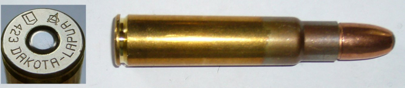 eine Deko-Patrone .423 Dakota ( 423 DAKOTA-LAPUA ) 2007 von Lapua gefertigt. ist aber nicht auf dem Markt erschienen. Patrone ist ohne Ladung, zum Nachweis ist eine Klapper-Kugel eingelegt.