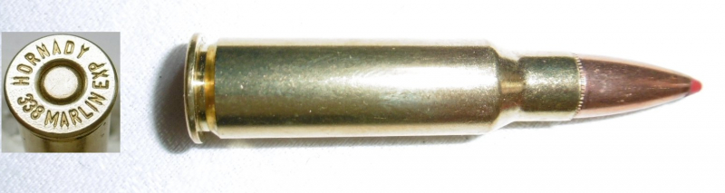 eine Deko-Patrone .338 Marlin Express ( HORNADY 338 MARLIN EXP ) Ein neues Lever-Action-Kaliber. Patrone ist ohne Ladung, zum Nachweis ist eine Klapper-Kugel eingelegt.