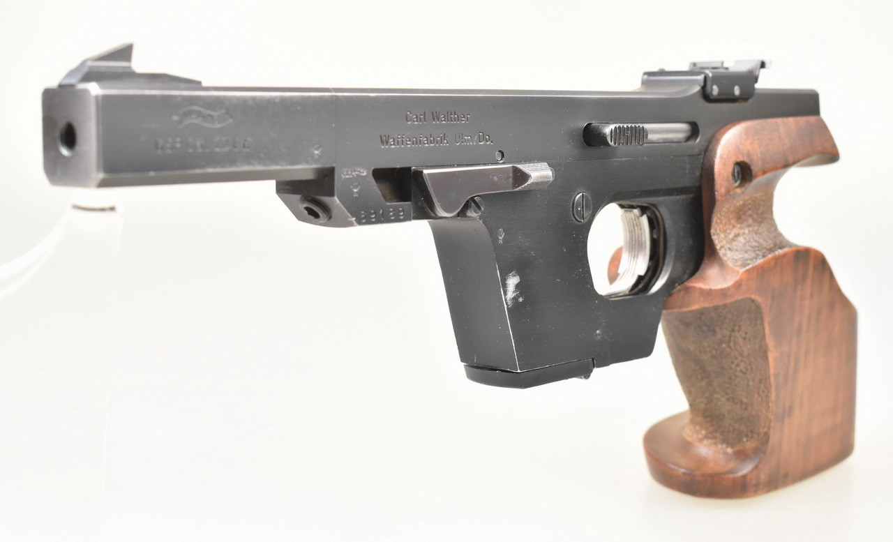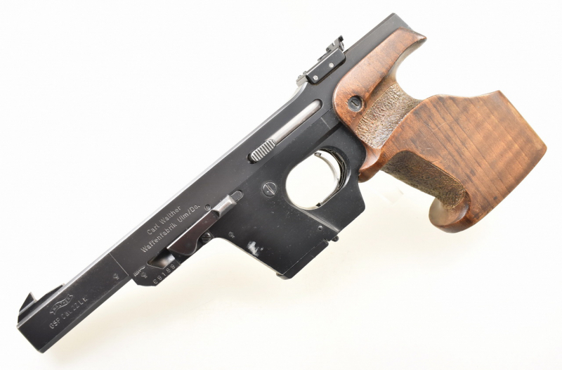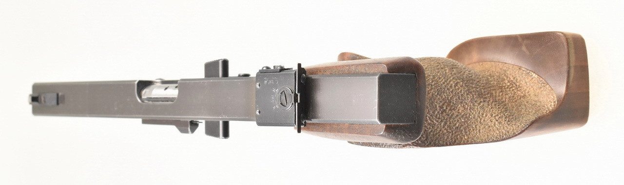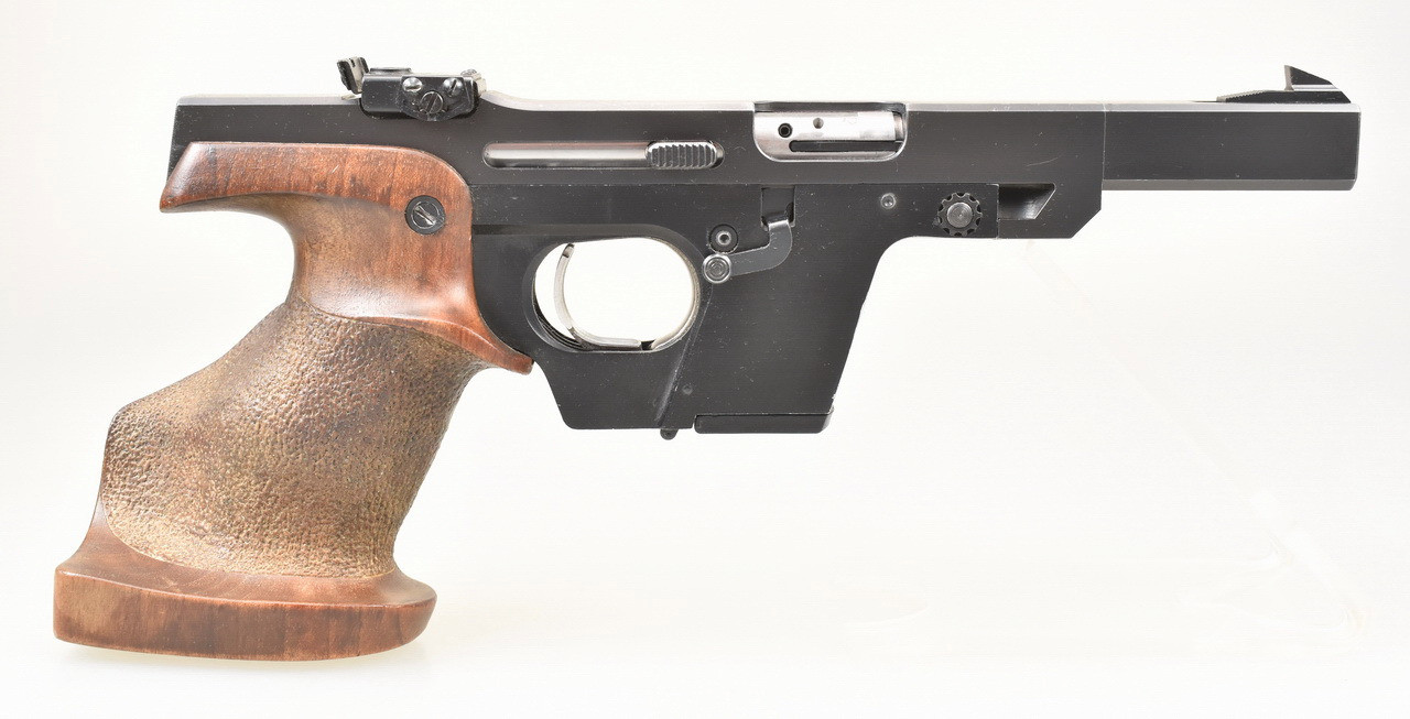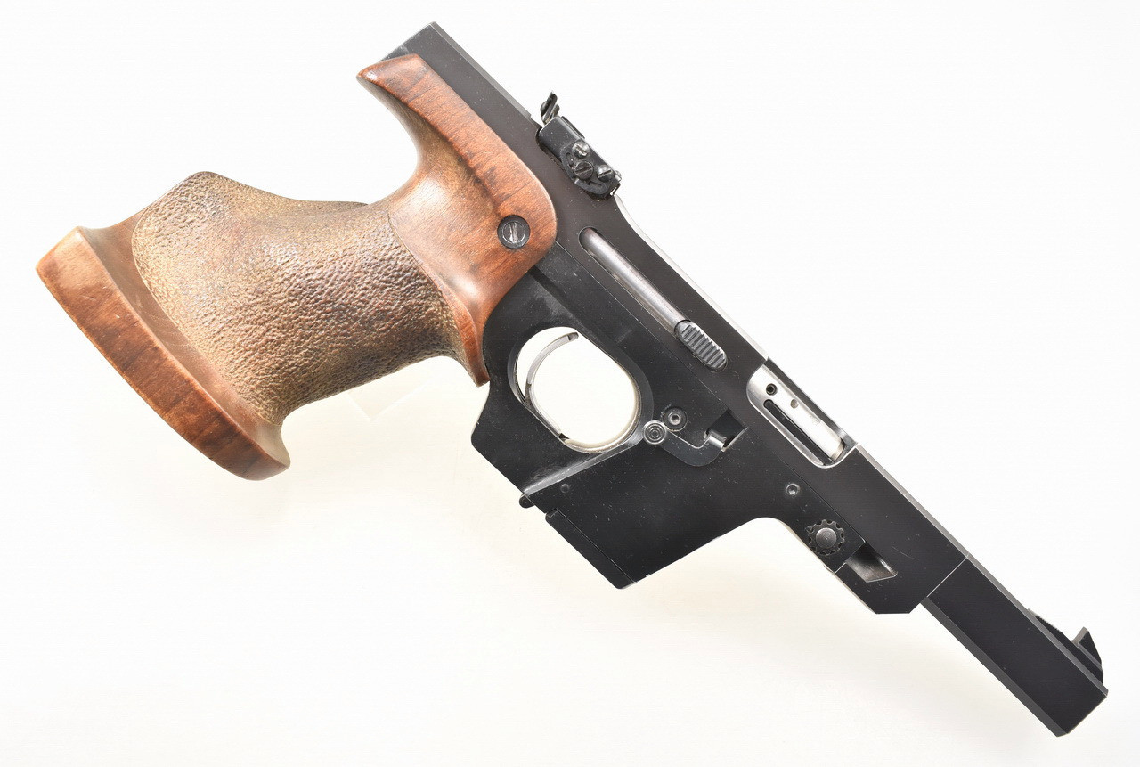 116mm langer, spiegelblanker Lauf. Beschuß 1977. Magazin für 5 Patronen. Höhen- und seitenverstellbare Mikrometervisierung. Balkenkorn. 219mm lange Visierlinie. Punzierte Rechtsschützen Formgriffschale in Griffgröße S . Zustand und Details siehe Bilder.