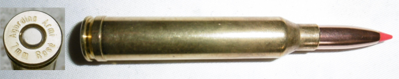 eine Deko-Patrone 7mm Rose` ( Agordino Armi 7mm Rose`) Eine Sonderbestellung für den ital. Büchsenmacher Agordino. Das Kaliber ist nach seiner Tochter Rose`benannt. Patrone ist ohne Ladung, zum Nachweis ist eine Klapper-Kugel eingelegt.