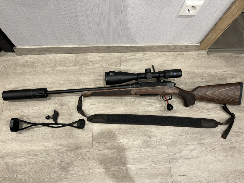 Haenel Jaeger NXT in Kaliber .30-06 Springfield, ausgestattet mit einem Haenel JGR Schalldämpfer. Die Waffe ist mit einem Zeiss V4 3-12x56 Zielfernrohr versehen und verfügt über einen Haenel Gewehrriemen. Zusätzlich ist ein Zeiss Adapter zur Nutzung mit Wärmebildvorsatzgeräten enthalten. Die Kombination ist für den jagdlichen Einsatz ausgelegt und bietet eine moderne Ausstattung mit optischer Präzision und modularer Erweiterbarkeit. Wenige Gebrauchsspuren, Technisch in sehr guten Zustand. 100m Fleck mit RWS HIT 165gn eingeschossen. Trifft Loch in Loch!