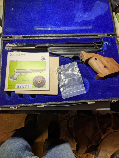 Ich biete eine FWB 65 mit gutem Druck. Das Abzugsgewicht kann von 500 auf 1360 g umgestellt werden und der Rücklauf des Schlittens kann mit einem Verriegelungsstück blockiert werden, um einen Rückstoß entsprechend dem einer Gebrauchspistole zu spüren. Mit Kasten und zugehöriger Anleitung.
