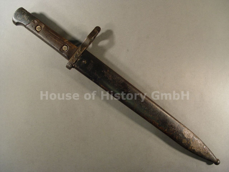 Österreich Bajonett M 1895 für Mannlicher Stutzen, mit Hersteller und diversen Abnahmen, Holzgriffschalen vermutlich ergänzt, auf jeden Fall mit neuen Schrauben befestigt, Zustand siehe Fotos