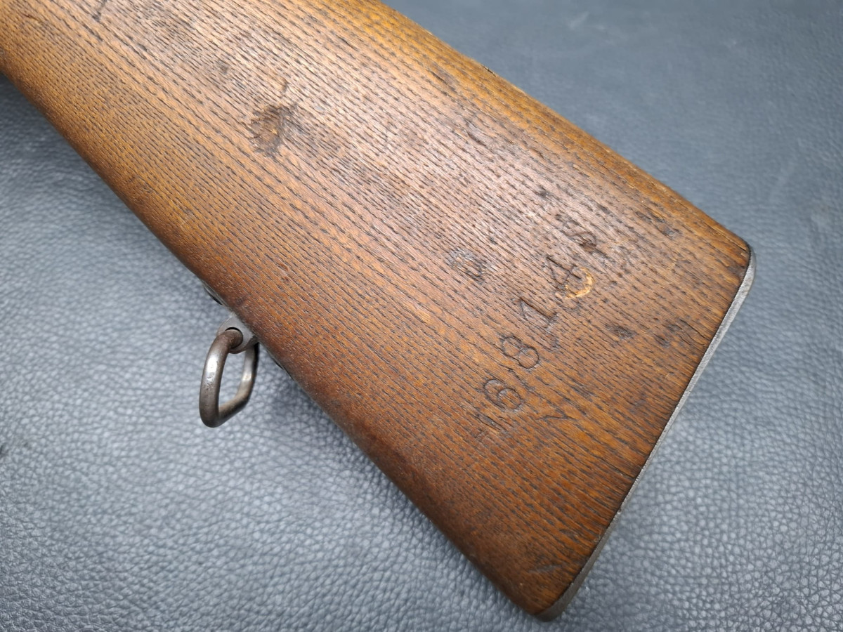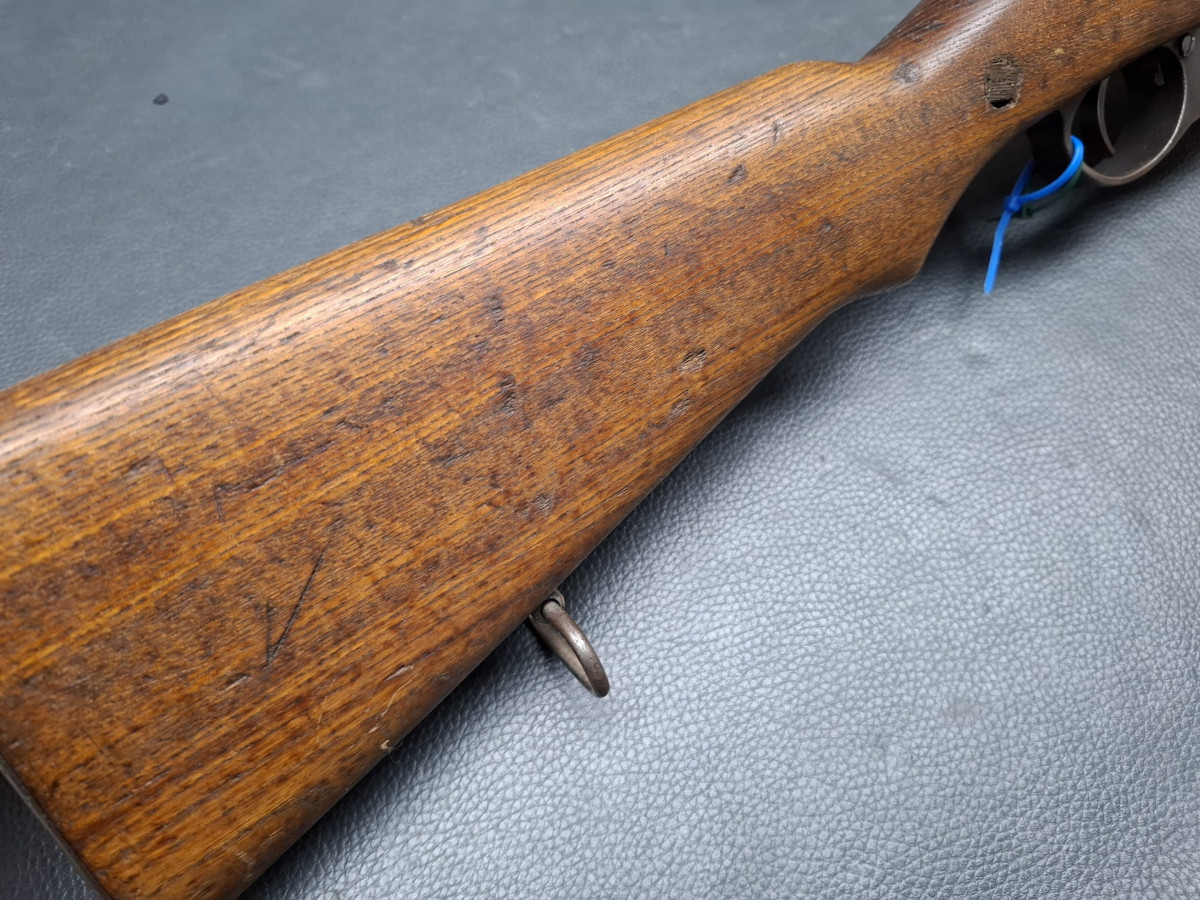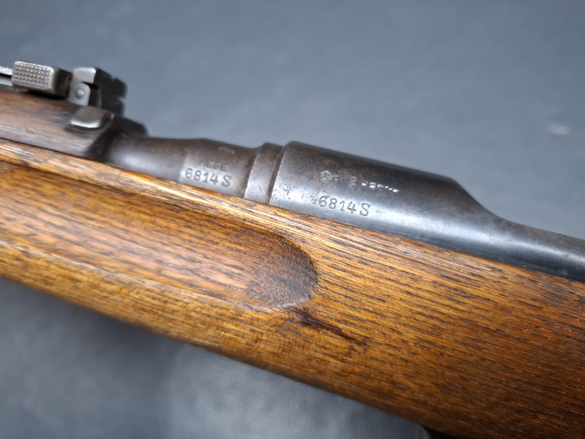 Lauf gut, Brünierung 96%, Schaft mit altersbedingten Gebrauchsspuren, Lauf leicht rau aber noch gut, deutliches Profil