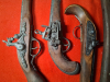 Ein Set dekorativer Waffen steht zum Verkauf. Das Gewehr hat einen gebrochenen Lauf. Bei einer Pistole ist der Mechanismus defekt. Es handelt sich um dekorative Waffen.