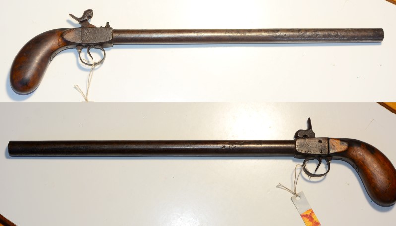 Perkussionsterzerol um 1860, keine Stempelung, Lauflänge 35,9 cm, Gesamtlänge 49,2 cm, Kaliber 10,7 mm, am Holzgriffstück 2 alte Reparaturen (professionell), Metall braun, Hahn mit Rostspuren, technisch völlig in Ordnung