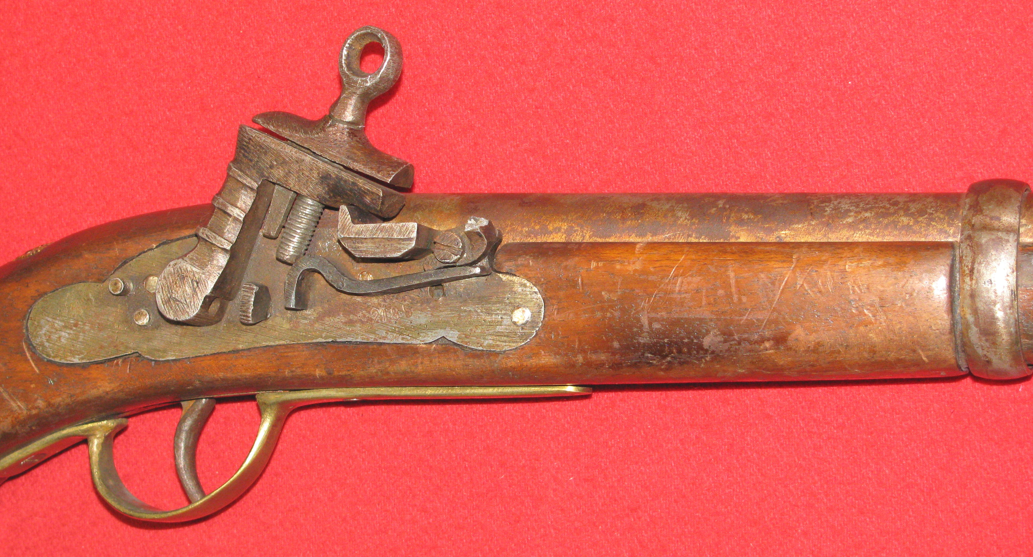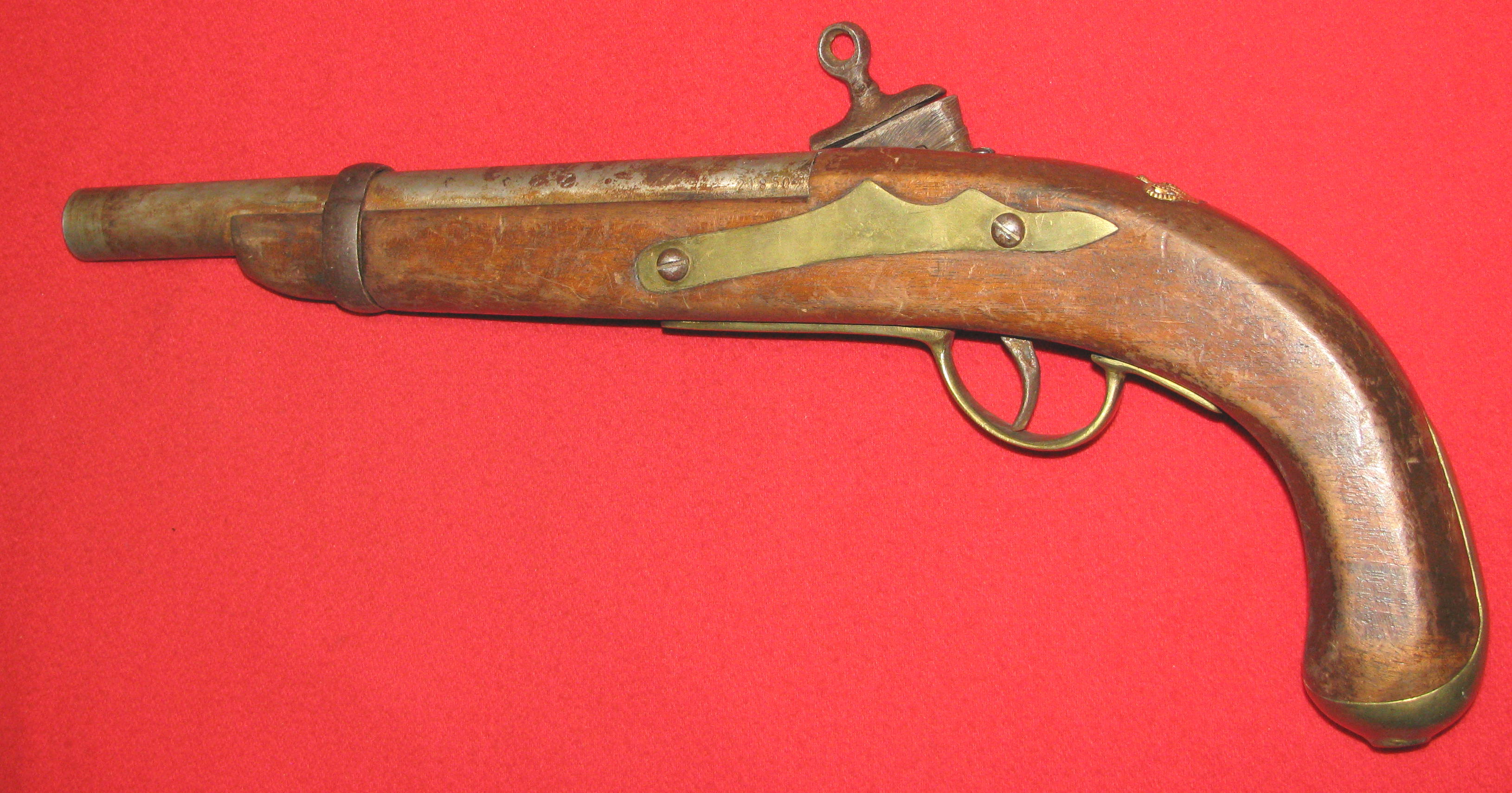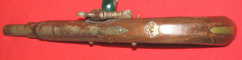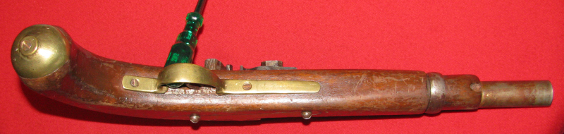 Zum Verkauf kommt eine Steinschloss Pistole mit Fehler an der Batterie, da ist was abgebrochen
