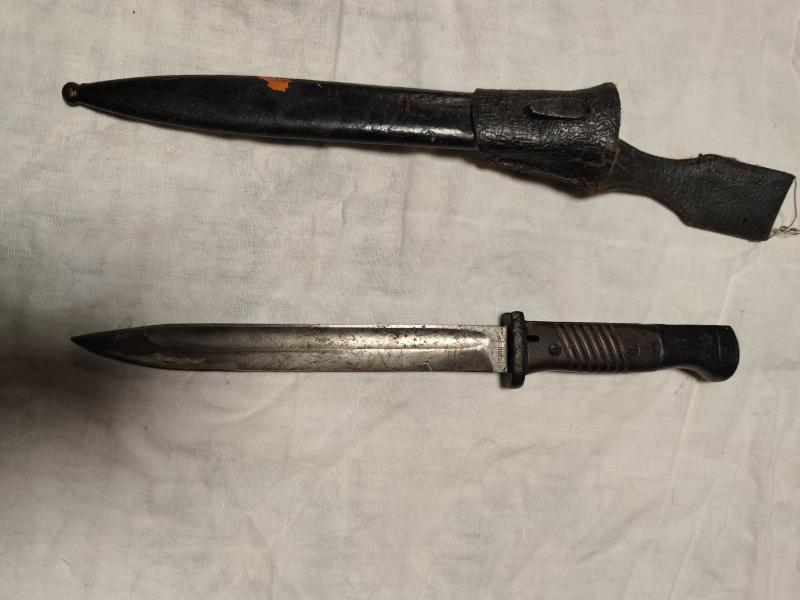 Die Klinge ist in einem Recht gutem Zustand. Die Griffschalen und die Schrauben scheinen original zu sein. Leider hat mal jemand versucht, das Griffstück und die Scheide zu lackieren. Deshalb muss das Bajonett wohl mal gereinigt werden,um die Funktion wieder herzustellen.