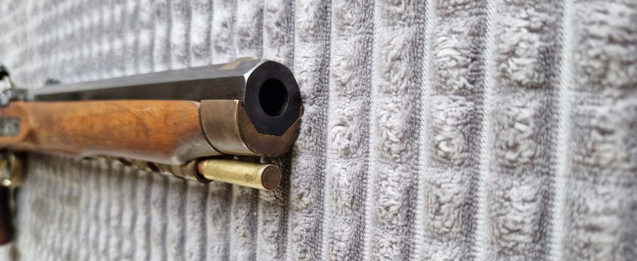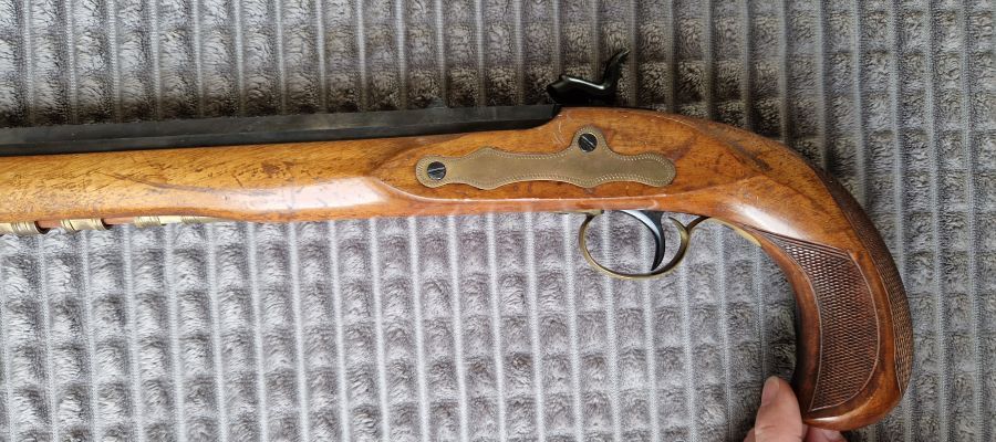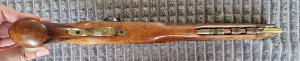 Gravierte Messinggarnitur. Holzladestock mit Messingabschluß.