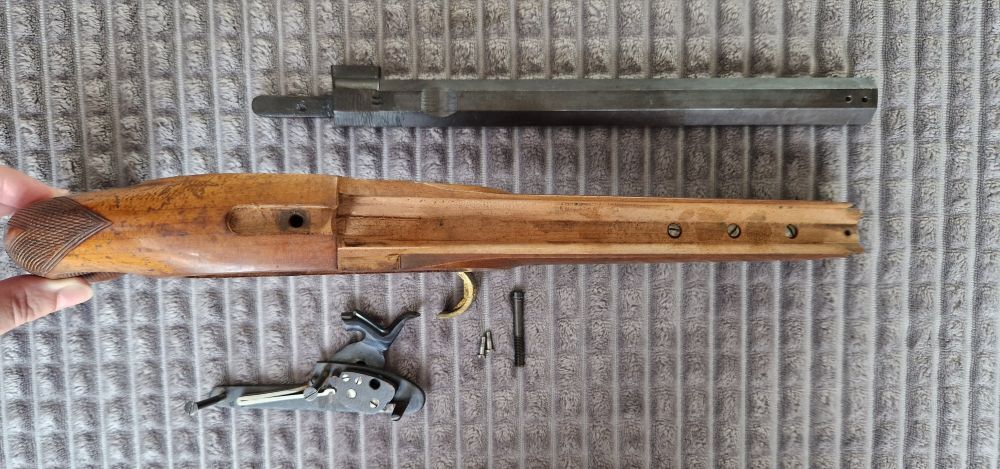 Nussholzschaft mit Fischhaut geschnittenem Griff.