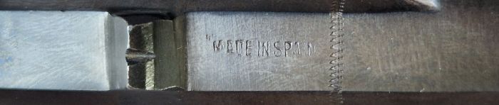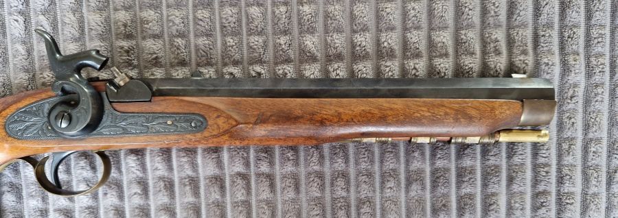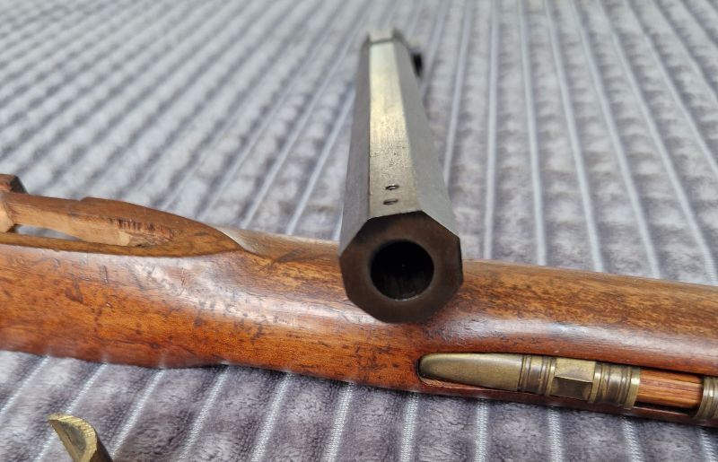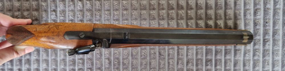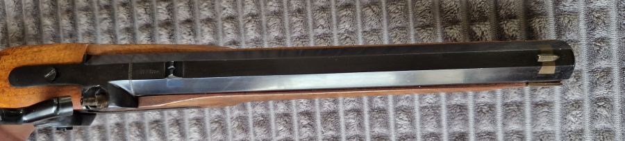 Gebläuter achtkantiger Lauf. Feststehende Visierung. Cal. 45 gezogen. Oberkante made in Spain.