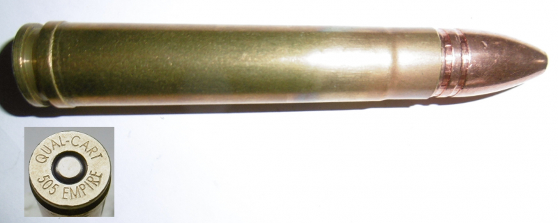 eine Deko-Patrone .505 Empire ( QUAL-CART 505 EMPIRE ) Ein Eigenkaliber der Empire Rifles Co. in Meriden, NH. Quality-Cartridge stellt ehemalige wildcats als Kleinserie mit korrektem Kaliber im Bodenstempel her. Patrone ist ohne Ladung, zum Nachweis ist eine Klapper-Kugel eingelegt.