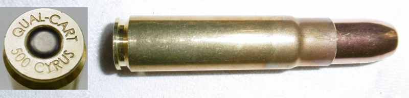 eine Deko-Patrone .500 Cyrus ( QUAL-CART 500 CYRUS ) Quality-Cartridge stellt ehemalige wildcats als Kleinserie mit korrektem Kaliber im Bodenstempel her. Patrone ist ohne Ladung, zum Nachweis ist eine Klapper-Kugel eingelegt.