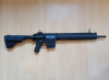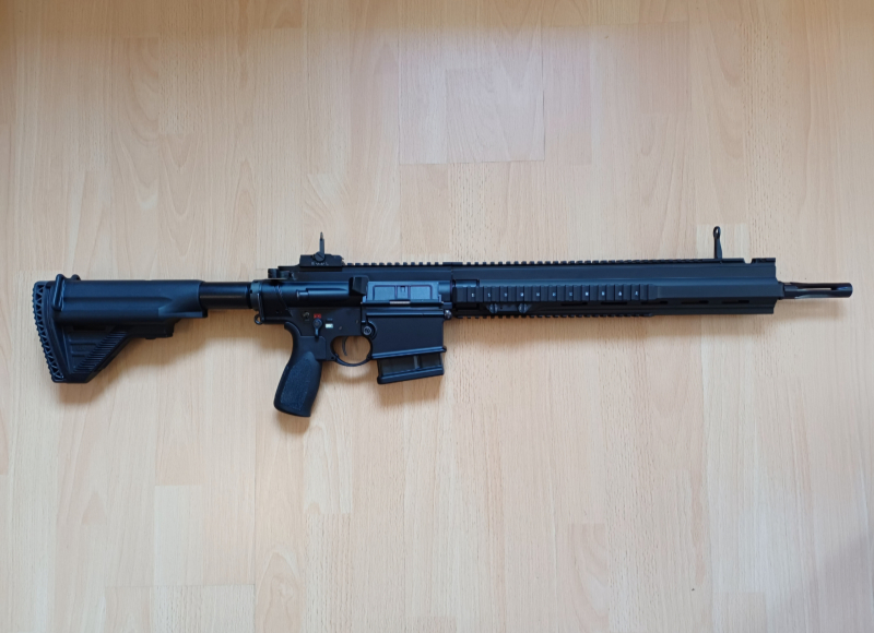 Ich verkaufe hier mein HECKLER & KOCH MR308 mit verstellbarer 5 Position Gasabnahme von WAFFEN BURK. Da es sich hier um die A1 Variante (ohne lästige beidseitige Bedienelemente) handelt, fällt das Magazin auch nicht ständig ungewollt heraus, wenn die Waffe mit Waffengurt am Körper getragen wird (siehe MR308 A3). Dank 16,5 Zoll-Lauf ist die Selbstladebüchse mit jedem Handschutz sportlich zugelassen. Das Match Rifle wurde von mir 2012 neu gekauft (Rechnung liegt bei), auf Funktion und Präzision getestet (Schussbelastung < 600 Schuss) und dann leider recht lange nicht genutzt, da meine örtliche Schießanlage neu aufgebaut werden musste. Die Waffe würde immer sorgsam behandelt, sauber und mit Öl geschützt gelagert und befindet sich entsprechend in einem sehr guten Zustand. Da ich auch nach Wiedereröffnung meines Schießstandes das MR308 nicht wirklich benutzt habe, habe ich mich schweren Herzens zum Verkauf der Waffe durchgerungen. Hierfür habe ich die Waffe von HECKLER & KOCH auf Sub-MOA-Präzision überprüfen lassen. Beim Kauf gibt es die zwei Anschusskarten vom 04.06.2025 (19,7 mm und 14,5 mm Streukreis) dazu. Auf Anfrage, zeige ich die Bilder auch gerne vor Auktionsende (keine Katze im Sack). Ich hatte die Waffe nach dem Präzisionsnachweiß für einen Bekannten reserviert, der vor kurzem leider recht unverhofft aus persönlichen Gründen abgesprungen ist. Seit der Rückkehr von HK steht sie also wieder nur im Schrank. Folgende Teile wurden verbaut: Verstellbare 5 Positionen Gasentnahme von Waffen BURK Heilbronn (370 €), HK G28-Handschutz mit integriertem Klappkorn (600 €), HK Klappkimme (210 €), HK G28 Käfigdämpfer (195 €), HK MR308 Verlängerte Durchladehebelklinke (40 €). In Summe mehr als 4500 €. Die Rechnungen und sämtliche Originalteile gibt es natürlich dazu. Lieferumfang: MR308, wie auf den Bildern, 10-Schuss-Magazin, kurzer HK MR308 Quad-Rail-Handschutz, Trommelvisier, Gasabnahme ohne Verstellmöglichkeit, Klappkorn für Gasabnahme, Mündungsschutzmutter, Bedienungsanleitung. Nach Ende der Auktion teile ich gerne eine Liste aus Anbauteilen, die ggf. von Interesse sein könnten. Abgabe nur an Erwerbsberechtigte. Versand nur mit Overnite. Privatverkauf.