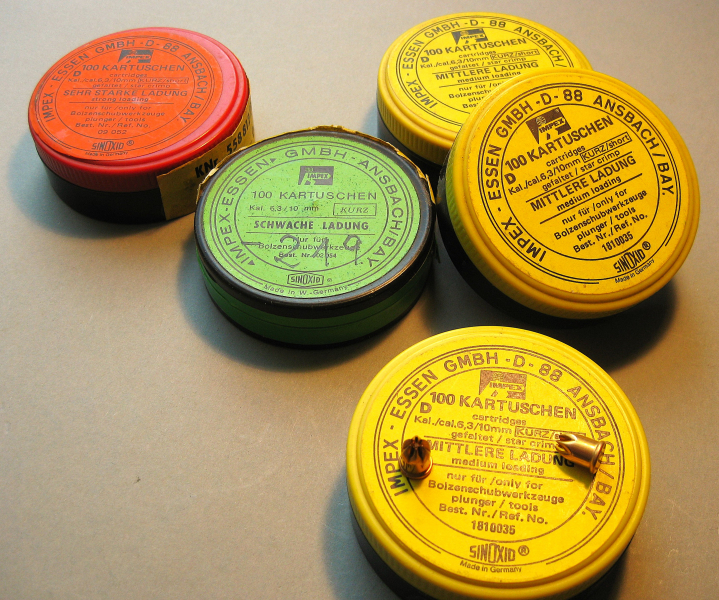 Aus einem Nachlass werden verschiedene Kartuschen der Firma Impex Essen GmbH im Kaliber 6,3x10 (gefaltet) für Bolzenschubwerkzeuge angeboten. Sie sind original verpackt und sind in neuwertigem Zustand. 1 Dose a 100 Stück grün = schwache Ladung; 3 Dosen a 100 Stück gelb =mittlere Ladung und 1 Dose a 100 Stück rot = sehr starke Ladung. Die Bilder sind Bestandteil der Auktion. Dieses ist ein Privatverkauf, daher keine Garantie oder Rücknahme. Bitte beachten sie auch meine anderen Angebote.