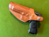 Es handelt sich hier um ein klassisches Innenbund-Holster, rechtshand, das sowohl Innenbund eingesteckt als auch am Gürtel getragen werden kann. Es besteht außen aus hochwertigem hellbraunen Sattelleder, ist offen am Lauf, und außer den üblichen Druckknopfverschluss verfügt über eine 360° drehbare Gürtelschlaufe