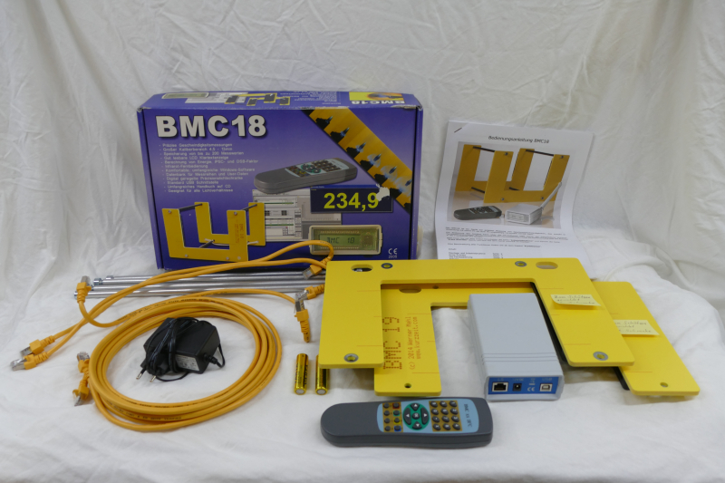2 Rahmenplatten mit Messsensoren sowie 4 Rahmenrohre, div. Kabel, Fernsteuerung, Messeinheit, Batterien (gebraucht), Netzteil, Anleitung in gedruckter Form, Originalverpackung