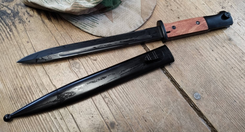 Wehrmachtsbajonett "Seitengewehr 84/98" für Karabiner 98 geschwärzte Klinge aus 8Cr14MoV Stahl mit Glattschliff und Hohlkehle verschraubte Holzgriffschalen Druckknopf-Arretierung am Griffende Metallscheide passender Bajonettschuh Art.Nr. 44088 Gesamtlänge: ca. 38 cm Klinge: ca. 24,5 cm Klingenstärke: ca. 5,2 mm Gewicht: ca. 435 g Gewicht mit Scheide: ca. 600 g