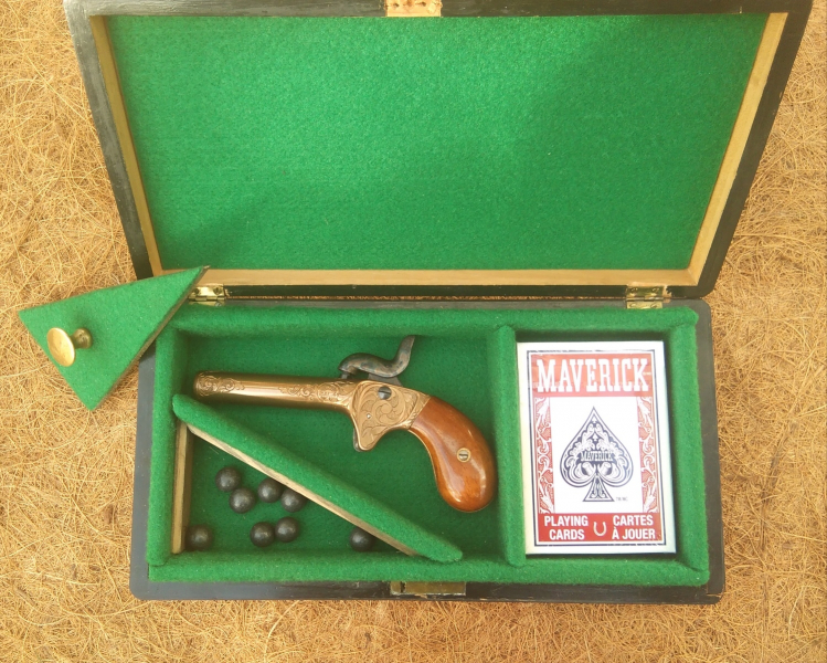 Sehr schöne Spielerschatulle mit Intarsien eingelegt. Dazu passend ein selten gravierter Turner-Kirkland Deringer aus Messing.Cal.41