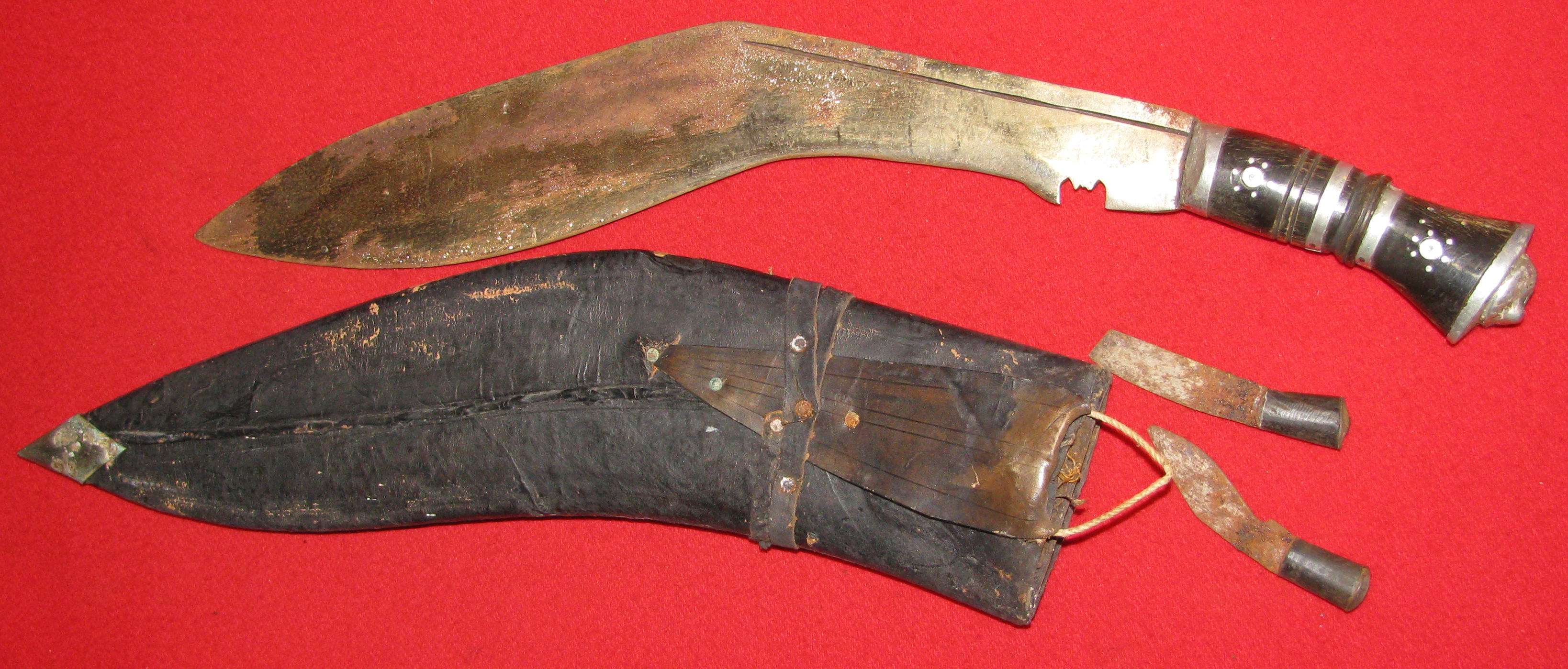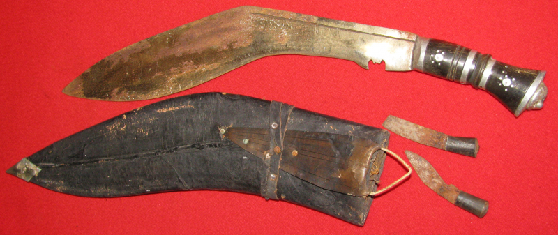 Zum Verkauf kommt ein, wohl schon älteres, Khukuri - Messer mit Scheide und zwei Beimessern