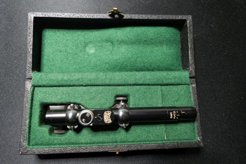 Zustand sehr gut. Geringfügige Gebrauchs- und Montagespuren sind vorhanden. Das Zielbild ist überraschend groß und es ist zudem scharf und kontrastreich. Die Glasoberflächen sind wie neu. Lieferumfang in originaler Schatulle.