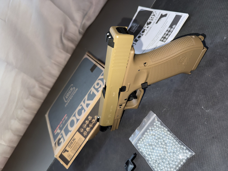 Glock 19x blowback 4.5mm 3 joule co2 neuwertiger Zustand. Mit co2 Kartuschen und Kugeln, gegen Aufpreis auch mit schnellzieh oberschenkelholster.