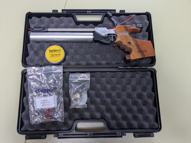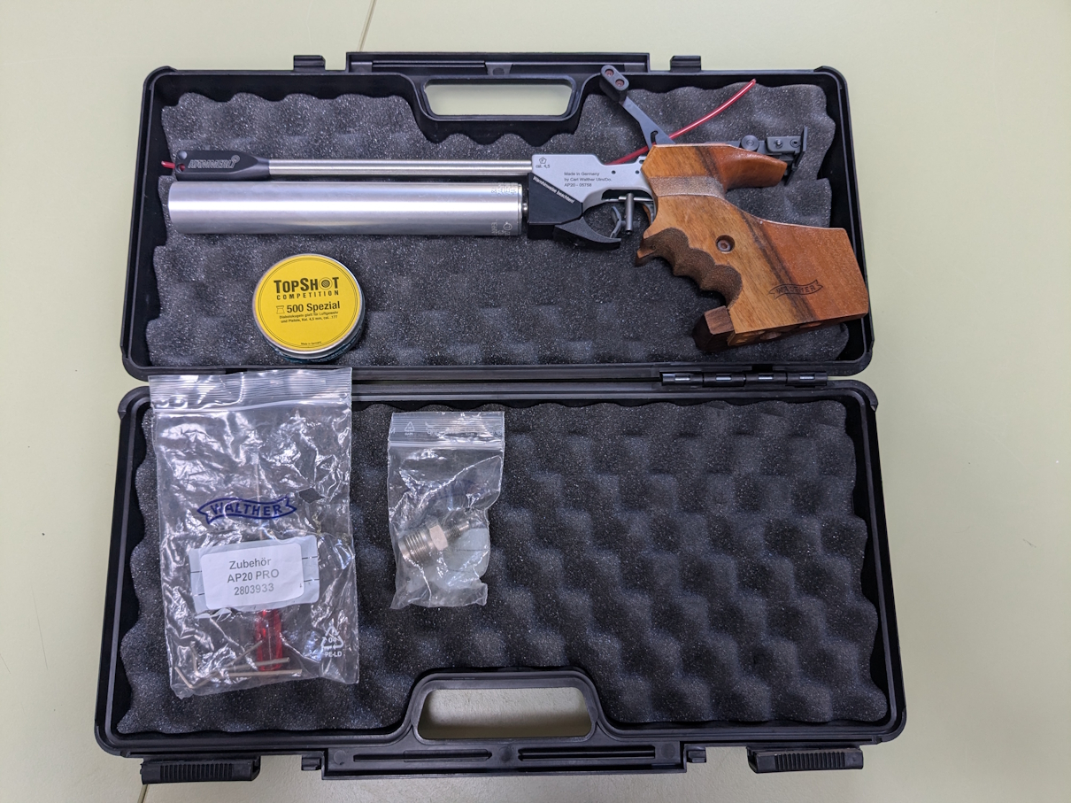 Lieferumfang: Hämmerli AP20 Pro Match-Luftpistole (mit Edelstahl-Laufmantel); Originaler Nussbaum-Formgriff (Rechts, Größe M) Walther Aluminium-Pressluftkartusche (TÜV bis 04/2027) mit Manometer Originaler Hämmerli Transportkoffer Füllstutzen (Adapter für 200 bar) Werkzeug-Set & Zubehör Restbestand TopShot Competition Diabolos