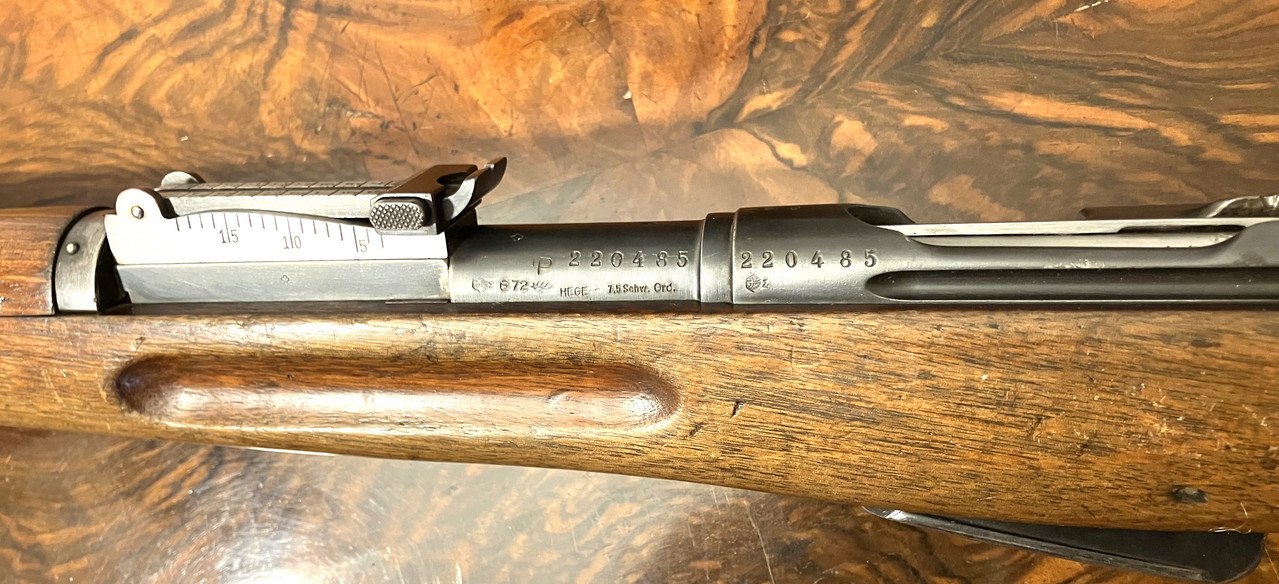 Versteigert wird der abgebildete schweizer RepetiererK11 in 7,5x55 mit CIP-Beschuss. Die Waffe ist gut gepflegt, nummerngleich und voll funktionsfähig. Auch das Laufinnere ist in sehr gutem Zustand : - )