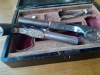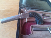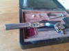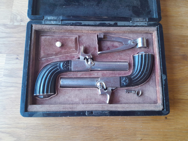 es handelt sich hier um ein schönes Reisepistolenpaar im Kasten (siehe Bilder). Die Waffen sind hochwertig gearbeitet, die Läufe sind aus Damast, die Waffen sind schön graviert und die Abzüge erscheinen erst beim Spannen der Percussions-Hahne. Die Hähne rasten sauber in zwei Stellungen ein. Die länge jeder Pistole beträgt ca. 16 cm. Die Waffen verfügen über gezogene Läufe. Der zustand der Waffen ist hervorragend. Der Kasten hat ein Schloss mit Schlüssel, allerdings lässt sich der Kasten aktuell nicht abschließen.