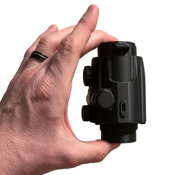 Die kompakte Bauform sorgt dafür, dass das Vorsatzgerät kaum aufträgt und die Balance der Waffe optimal erhalten bleibt – ein entscheidender Vorteil bei längeren Ansitzen oder der Pirsch.