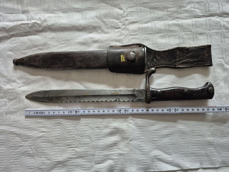 Verkaufe, aus dem Nachlass meines Vaters, Bajonett 98/05 mit Sägerücken, Scheide und Koppelschuh. Waffenfabrik Mauser AG Oberndorf a.N. Zustand siehe Bilder. Drücker funktioniert.