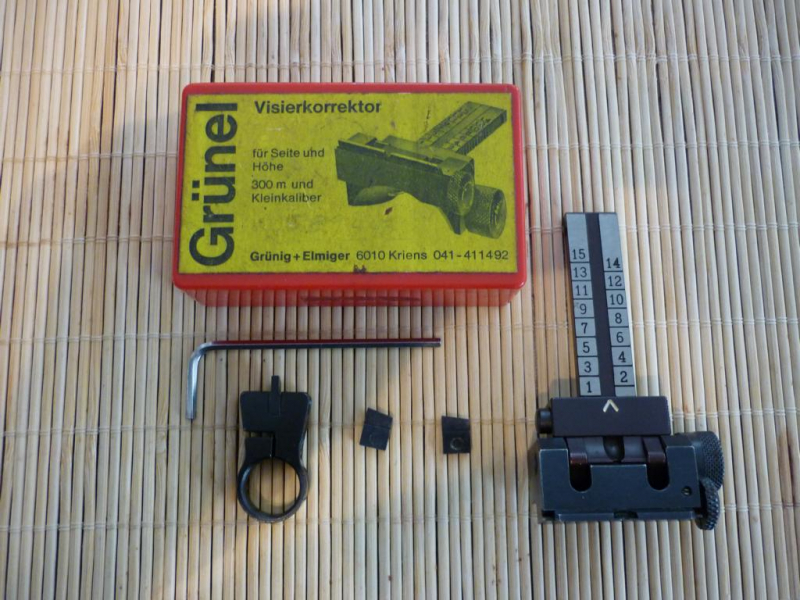 Sie bieten auf einen Visierausatz, Visierkorrektor der Firma Grünel. [Grünig+Elmiger] Kriens, Luzern. Es handelt sich um einen Korrektor der eine feine Verstellung in der Höhe sowie der Seite erlaubt. Der Korrektor wird auf das bestehende Kimmenblatt [Visier] aufgesteckt und mittels einer Inbus Madenschraube festgeklemmt. [das Visier wird ebenso mitgeliefert] Weil dadurch die Visierlinie leicht erhöht ist, muss das dazugehörige Korn montiert werden. Das Korn mit Montagering wird auf den Lauf geschoben und festgeklemmt. Drei Korne sind dabei, Breite 1,8 / 2,0 / 2,2 mm