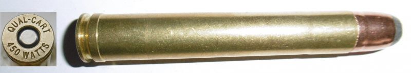 eine Deko-Patrone .450 Watts ( QUAL-CART 450 WATTS ) Quality-Cartridge stellt ehemalige wildcats als Kleinserie mit korrektem Kaliber im Bodenstempel her. Patrone ist ohne Ladung, zum Nachweis ist eine Klapper-Kugel eingelegt.