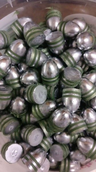 Die Geschosse sind ladefertig mit Schwarzpulverfett gefettet. Diameter oben .450, unten .443 zum leichten ansetzten in die Trommel.