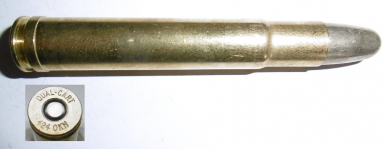 eine Deko-Patrone .424 O`Neil-Keith-Hopkins ( QUAL-CART 424 OKH ) Quality-Cartridge stellt ehemalige wildcats als Kleinserie mit korrektem Kaliber im Bodenstempel her. Patrone ist ohne Ladung, zum Nachweis ist eine Klapper-Kugel eingelegt.