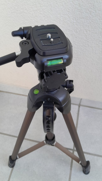 der schwenkbare Stativkopf ist mit einer Nivellier-Wasserwaage und Nivellier-Libelle für gutes Ausrichten versehen,