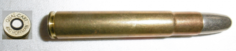 eine Deko-Patrone .400 Hoffman ( QUAL-CART 400 HOFFMAN ) Quality-Cartridge stellt ehemalige wildcats als Kleinserie mit korrektem Kaliber im Bodenstempel her. Patrone ist ohne Ladung, zum Nachweis ist eine Klapper-Kugel eingelegt.