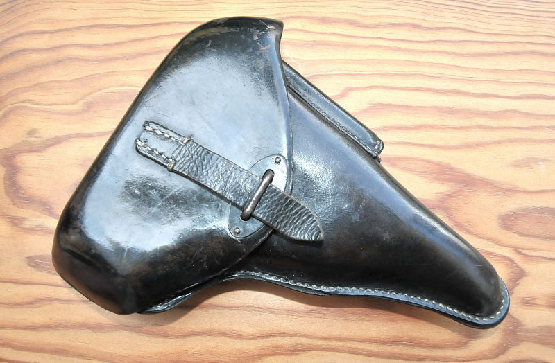 Das kräftige schwarze Leder ist fest, original glänzend, sehr gut erhalten. Die schwarze Farbe des Taschendeckels ist infolge Gebrauchs stellenweise der darunterliegenden braunen Lederfarbe gewichen. Die Außenseite des Holsters ist noch fast makellos glatt, die Körperseite weist geringe typische Gebrauchs-und Kratzspuren auf, keine Beschädigungen. Die gelblich-weißlichen Nähte sind allseits komplett original und fest, auch an der Magazintasche und an den Koppelschlaufen. Der Zugriemen ist weich und ohne Schäden. Verschlussplatten komplett lackiert erhalten.