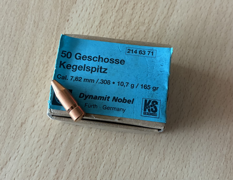Verkaufe aus Jäger-Nachlass RWS Kegelspitz Geschosse .308 165gr; Inhalt 50 Stück, Packung wurde schon mal geöffnet.