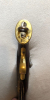 Ehemalige englische Steinschlosspistole, auf der Schlossplatte stehender Löwe, Knauf mit Regimentsstempelung A 3 105, Gesamtlänge 40cm, Lauf mit Schwanzschraube 27cm, Schloss 13,5cm, Schloss funktioniert, Hahn rastet nur einmal ein, Hauptfeder wurde mal geschweißt.