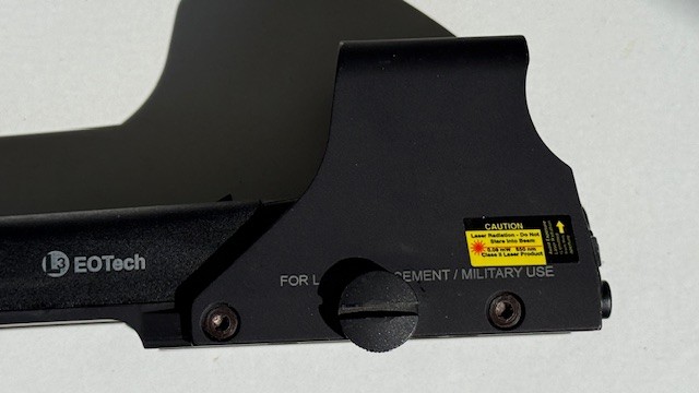 Das Eotech 512, Baujahr 2014 ist in gutem, wenig verwendetem Zustand mit geringen Gebrauchsspuren. Es wird mit zwei handelsüblichen AA- Batterien betrieben (=neu). Durch sein leichtzugängiges Batteriefach, dass mit einem Schnell- Verriegelungshebel gesichert ist, lassen sich Batterien auch unter schlechten Bedingungen, oder mit Handschuhen ohne umständliches Handling zuverlässig in kürzester Zeit austauschen. Die Befestigung erfolgt linksseitig mittels einer ¾ Zoll Rändelschraube. Die traditionell zum Festziehen der Schraube verwendete Quarter USD Münze liegt bei. Neupreis ab 640 €